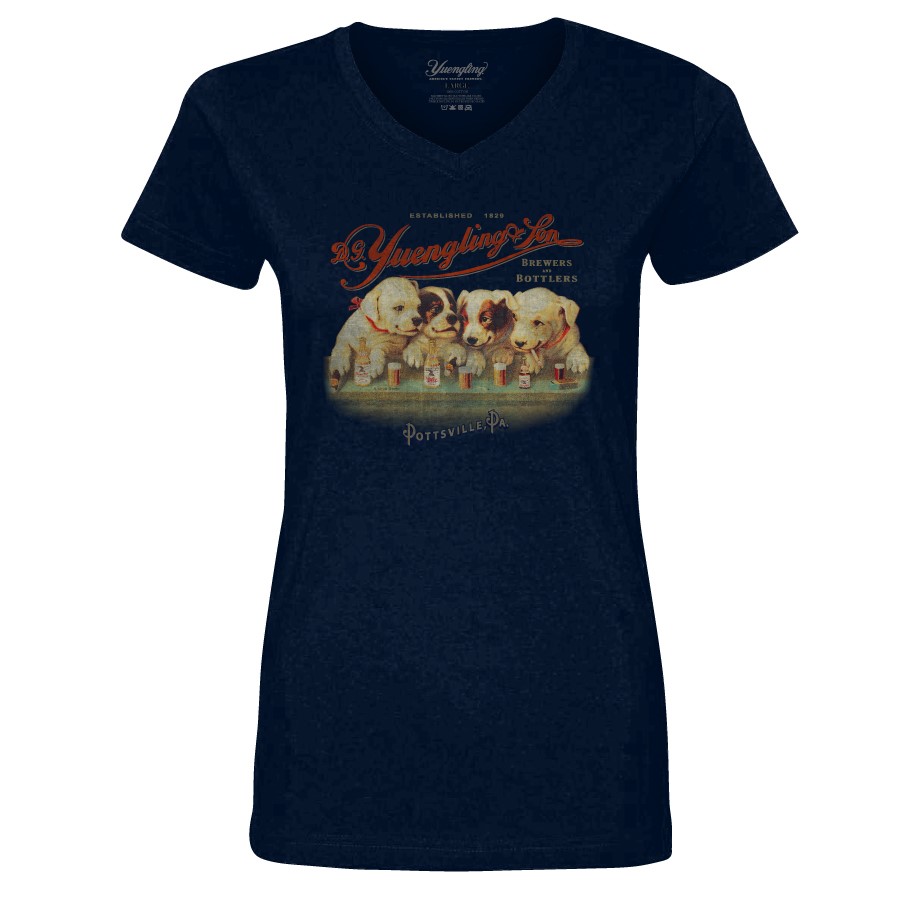 The Vintage Ladies Dogs Tee is essential to your D.G. Yuengling & Son collection. Featuring the classic Brewers and Bottlers artwork from our memorable 1907 dog calendar on the back and hometown of Pottsville, PA.