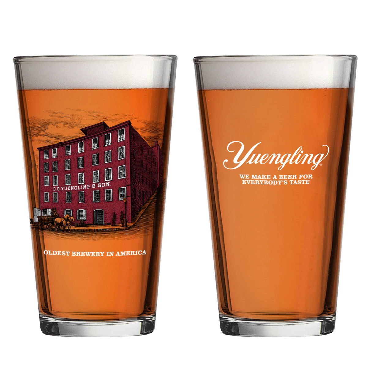 Enjoy a cold one in this Brewery 16oz pint glass. This 2-sided glass features our historic America’s Oldest Brewery building and company logo on opposite side. This glass is not dishwasher safe.
