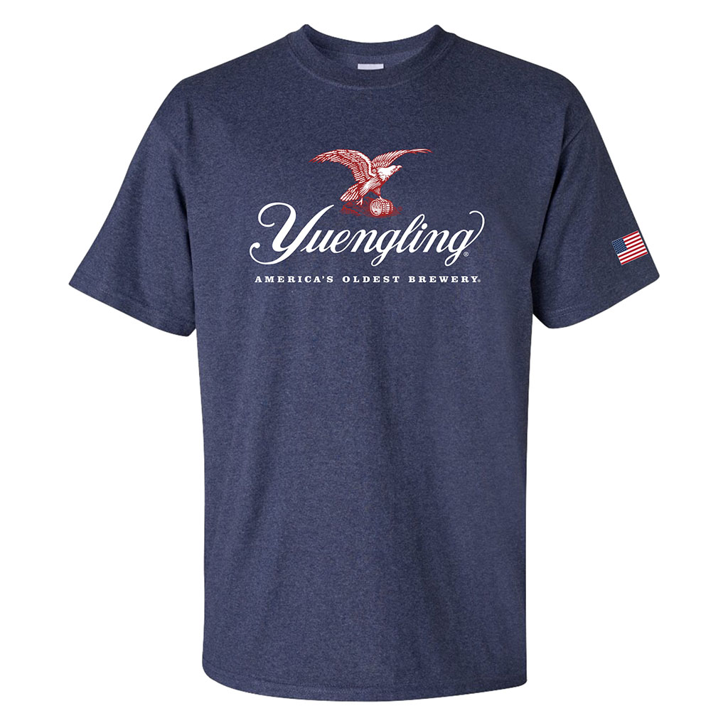 Feel great in this soft-knit tee featuring the Yuengling Eagle logo on front and American flag on right sleeve.